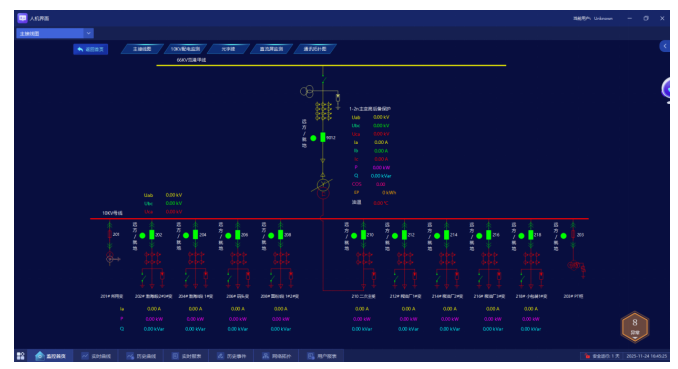 Acrel-1000變電站綜合自動(dòng)化系統(tǒng),以配電一次圖的形式直觀顯示配電線(xiàn)路的運(yùn)行狀態(tài),實(shí)時(shí)監(jiān)測(cè)各回路電壓、電流、功率、功率因數(shù)等電參數(shù)信息,動(dòng)態(tài)監(jiān)視各配電回路斷路器、隔離開(kāi)關(guān)、地刀等合、分閘狀態(tài)及有關(guān)故障、告警等信號(hào)。